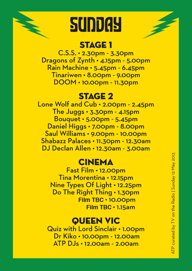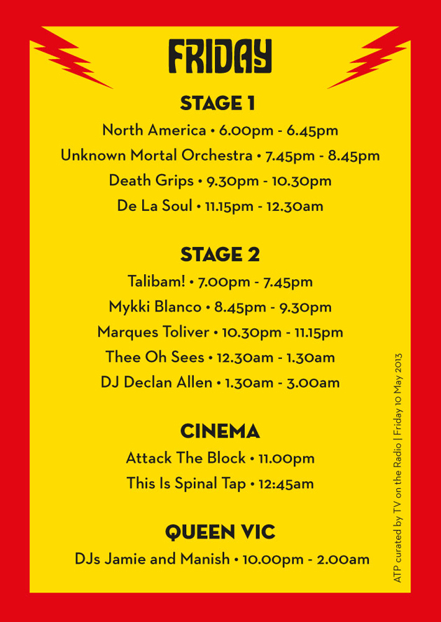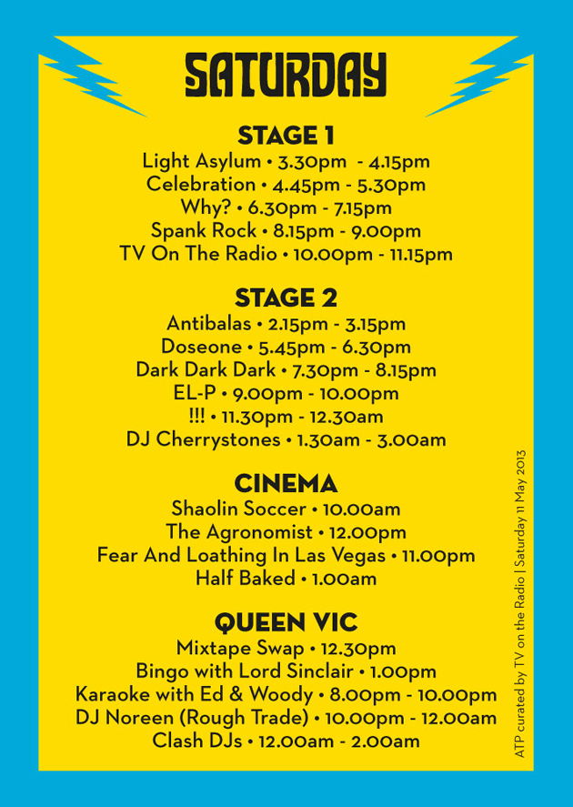 Below you can find the stage times, cinema and DJ schedules for ATP curated by TV On The Radio this weekend. Please be advised stage 2 and the cinema cannot hold the entire festival capacity at once so please bear this in mind and arrive early if you don't want to miss something...