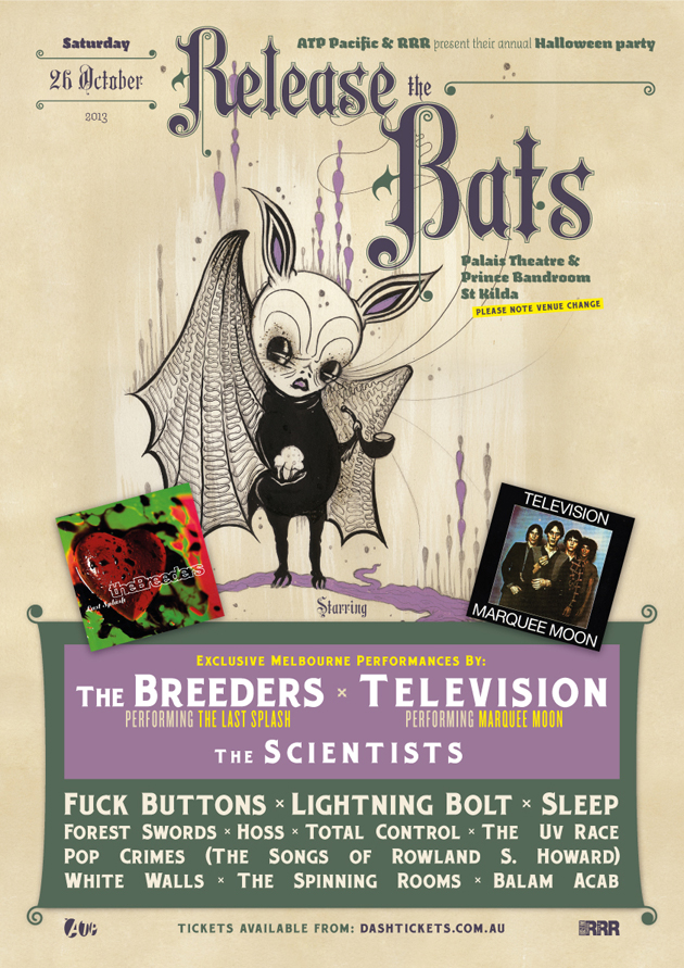 ATP will return to Melbourne for a special all day Halloween party called Release The Bats. Held on the Saturday 26th October, it will feature an incredible line-up of international and Australian artists chosen by ATP, and will be headlined by The Breeders performing Last Splash and Television performing Marquee Moon (both bands performing their only Victorian shows and it will be Television's only Australian performance of Marquee Moon). Halloween fancy dress is encouraged, and those dressed as something to do with one of the bands will be eligible to win some excellent prizes.