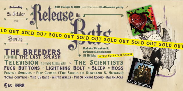 Today we can announce that ATP's Release The Bats Melbourne festival is totally sold out! Featuring Television performing their classic album 'Marquee Moon' in full, as well as The Breeders performing their landmark record 'Last Splash'; the lineup includes legendary live bands such as Sleep, Lightning Bolt, Fuck Buttons, as well as Australia's own The Scientists.