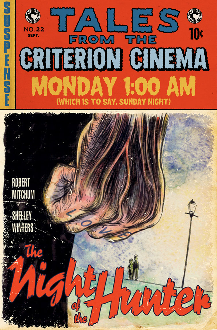 THE NIGHT OF THE HUNTER (1am) Director: Charles Laughton English, 1955, 93 min Click for: More Info / Trailer A horror movie with qualities of a Grimm fairy tale, starring a sublimely sinister Robert Mitchum as a traveling preacher named Harry Powell (he of the tattooed knuckles), whose nefarious motives for marrying a fragile widow, played by Shelley Winters are uncovered by her terrified young children. Graced by images of eerie beauty and a sneaky sense of humor, this ethereal, expressionistic American classic--also featuring the contributions of actress Lillian Gish and writer James Agee--is cinema's quirkiest rendering of the battle between good and evil. Art by Matt Kindt. |