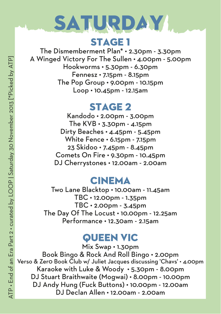 We'll be keeping people up to date with tweets and photos across the weekend. The hashtag for the weekend is #endofanera2 so remember to keep an eye on that and include it in your tweets to stay up to date - and to follow and keep an eye on our twitter account twitter.com/atpfestival in case we need to post any important updates about time changes or additional activities/events. You can also follow us on Instagram for photos we'll be taking through the weekend: instagram.com/atpfestival.