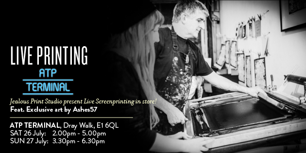 Join Jealous Print Studio and urban artist Ashes57, for a live screen printing event. Bringing a working screenprint studio to the masses, watch as the Jealous team demystify the print process and produce a signed print edition in front of your very eyes. Jealous will be inviting the public to get involved, pull a print, and take home an affordable piece of urban art from Ashes57