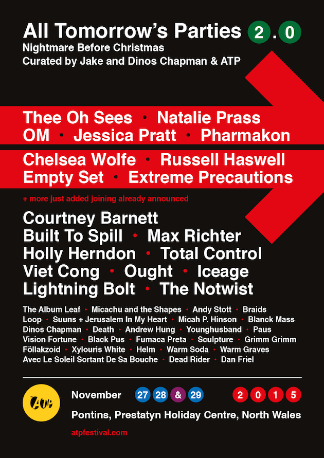 Thee Oh Sees, Natalie Prass, Om, Jessica Pratt, Chelsea Wolfe, Pharmakon, Xylouris White, Russell Haswell, Emptyset, Extreme Precautions, Helm, Warm Soda, Avec le Soleil Sortant de sa Bouche, Föllakzoid, Warm Graves, Dead Rider, Dan Friel, and Vatican Shadow added to ATP 2.0 Nightmare Before Christmas lineup curated by Jake and Dinos Chapman & ATP, November 27th-29th 2015 at Pontins Prestatyn.
