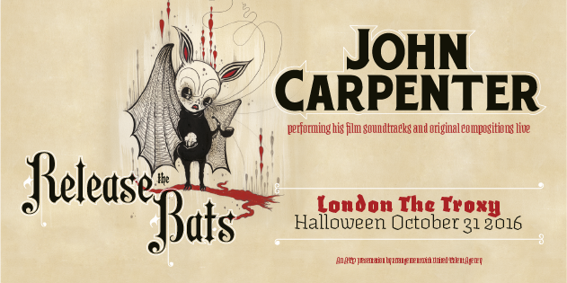Next Halloween, John Carpenter will perform - live and in person - a musical retrospective of his horror soundtrack work, his debut studio album Lost Themes, plus brand new compositions. Release The Bats will be held first at The Albert Hall in Manchester on Saturday 29th October 2016, and then at London's The Troxy on Monday 31st October 2016. Both venues will be transformed Halloween style, and attendees are encouraged to dress up for the spooky spectacular.