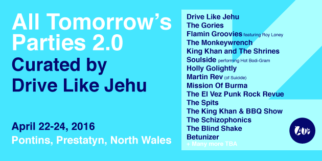 Tickets for groups of 4,5,6 & 7 (which include weekend festival entry plus 3 nights accommodation) to All Tomorrow's Parties Curated by Drive Like Jehu are available HERE.