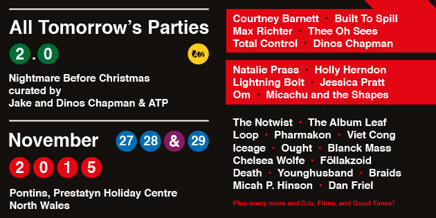 And there's more! Any customer who purchases Grimm Grimm's debut album 'Hazy Eyes Maybe' (listen to title track here) on either CD or LP in-store on the night of each gig will go into a draw to win a 4-berth chalet to ATP's Nightmare Before Christmas Festival curated by Jake and Dinos Chapman & ATP, November 27th-29th 2015 at Pontins Holiday Camp, Prestatyn, North Wales.